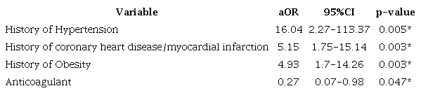 In the multivariate logistic regression model, age (≥ 65 years), gender and employment were considered as confounding factors and controlled in the analysis. The risk of stroke among AF patients significantly increased with the presence of a history of hypertension, aOR 16.04 (95%CI, 2.27-113.37; p=0.005), history of coronary heart disease/myocardial infarction, and history of obesity. Anticoagulant medication was significantly associated with a reduced risk of stroke among AF patients, aOR 0.27 (95%CI, 0.07-0.98; P=0.047) (Table 3).
