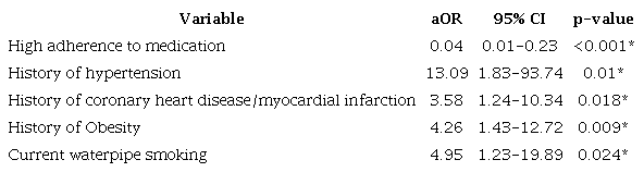 In the multivariate model, adherence to medications was assessed after adjustment on all potential confounders including socioeconomic and demographic, vascular, behavioral, and stroke risk factors. High adherence to medications was significantly associated with a reduced risk of stroke among AF patients, aOR 0.04 (95%CI, 0.01-0.23; p<0.001) (Table 4).