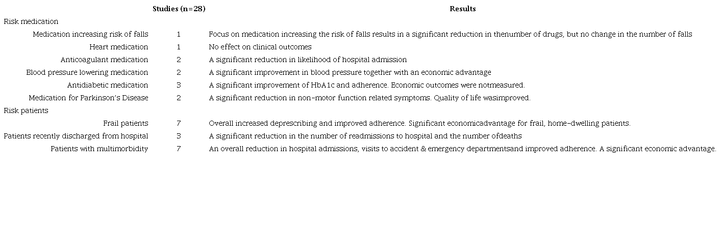 For specific subgroups of risk patients, the results show that a medication review can have economic advantages, reduce admission to hospital and improve compliance. This is shown for frail patients, recently discharged patients and multimorbid patients. Different models of medication review were used in these studies. All studies, apart from one, reported that the medication reviews were delivered by a pharmacist, with the remaining study not reporting who did the review. For four of the six studies showing an explicit economic effect, the medication review has included at least one follow-up. For the studies delivered at care homes, in the group of frail patients, no positive economic effects, were reported. 37, 39, 41 For two of three studies, medication reviews in care homes were obtained without interviewing the patient and no structured follow-up was described in the three studies. 37, 39 See Table 1 for a summary for each patient group.