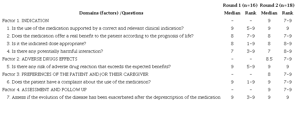 Methods: We carried out a systematic review to identify previously published tools. A composite proposal of algorithm was made by following the steps from clinical experience to deprescribe medications. A 2-round electronic Delphi method was conducted to establish consensus. Eighteen experts from different countries (Colombia, Spain and Argentina) accepted to be part of the panel representing geriatricians, internists, endocrinologist, general practitioners, pharmacologists, clinical pharmacists, family physicians and nurses. Panel members were asked to mark a Likert Scale from 1 to 9 points (1= strongly disagree, 9= strongly agree). The content validity ratio, item-level content validity, and Fleiss’ Kappa statistics was measured to establish reliability. The same voting method was used for round 2.