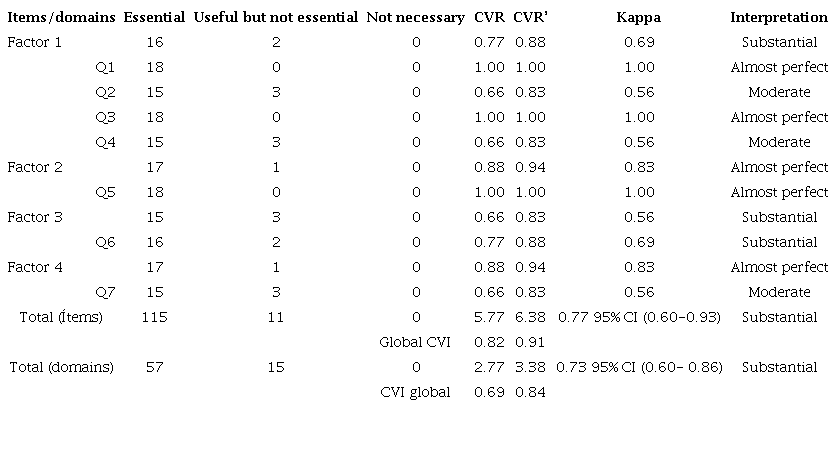 The content validity ratio (CVR) for each item was evaluated using a three-degree range scale (not necessary, useful but not essential, and essential). The minimum acceptance ratio was 0.58, according to Lawshe modified by Tristán. 18 Also, the content validity index was used to calculate the global reliability of the tool.