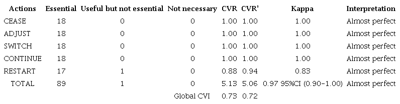 This phase was performed to stablish interrater reliability by measuring the content validity ratio, item-level content validity, and Fleiss’ Kappa of each domain, item, and action.