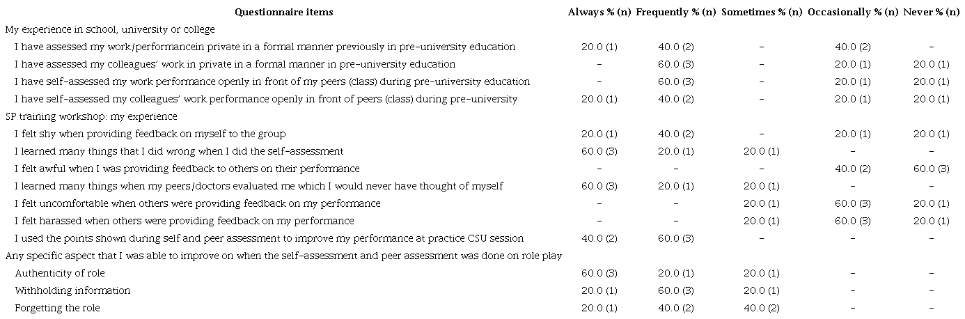 The results of the perception questionnaire applied at the final step showed that SPs were satisfied with the training method and standardization process ( Table 2). The overall average score received for the training program was 8.6 out of 10. Three SPs said they had improved in terms of their role-play authenticity, while two had improved information retention, and one had not forgotten the role details. Two SPs said the training helped them understand how to improve the simulation for clarity and indicated “I learned by watching other people’s performance.” There were no negative comments about the training method.
