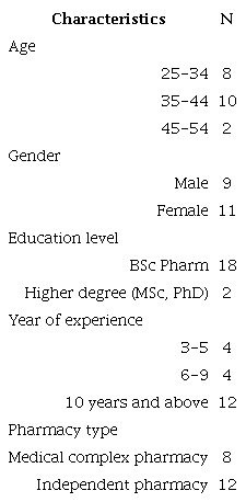 The majority of the participants (18) have a bachelor degree in pharmacy and only two of them completed higher degree. Most of them have experience of more than 10 years in community pharmacy. Table 1 shows the community pharmacists’ characteristics.