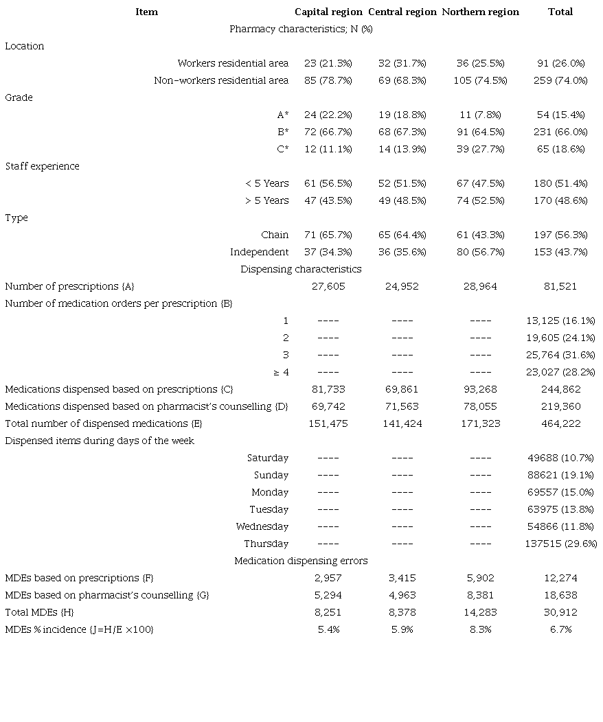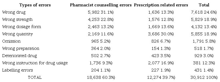 The total number of MDEs was 30912 (6.7%; CI 95%, 4.3-8.6) intercepted in 464,222 dispensed medications; this included 12274 PREs (2.6%; 95%CI 1.2-3.5), and 18,638 PCEs (4.1%; CI 95%, 2.9-5.7). Rates of errors among regions ranged from 5.4% to 8.3%. The majority of errors were made by pharmacists (76.5%; 23,641/30,912) followed by pharmacy assistants (23.5%; 7,271/30,912).