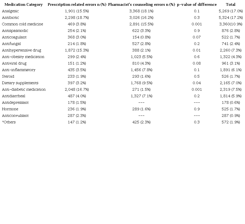 Antibiotics (17.2%; 5,324/30,912) and analgesics (17.0%; 5,269/30,912) accounted for most of the erroneous medications ( Table 3). There was no significant difference for erroneous medications between PREs and PCEs except for common cold medications (3.8% vs. 15.5%; p<0.05, respectively), antihypertensives (15.3% vs. 2.1%; p<0.05, respectively), dietary supplements (3.2% vs. 9.5%; p<0.05, respectively), and anti-diabetic medication (16.7% vs. 1.5%; p<0.05, respectively).