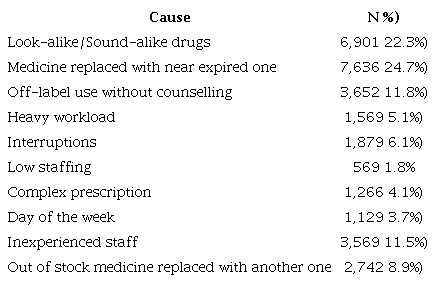 The major causes of MDEs were medicine replaced with near expire one (24.7%; 7,636/30,912) and Look-alike/Sound-alike drugs (22.3%; 6,901/30,912). The least frequent cause of errors was low staffing (1.8%; 569/30,912) ( Table 4).