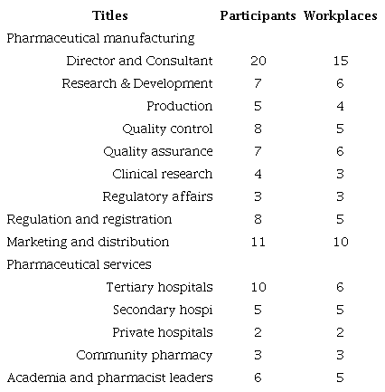 The study’s key informants included pharmacists who were leaders and practitioners in pharmaceutical supply chain, including pharmaceutical manufacturing, marketing and distribution, regulation and registration, hospital, community pharmacy, and academia. A purposive and snowballing sampling were used. The research team identified the first group of key informants who were well-accepted leaders in their area of practice, then further potential key informants were referred to within their networks. Table 1 presents numbers of key informants in different practice areas.