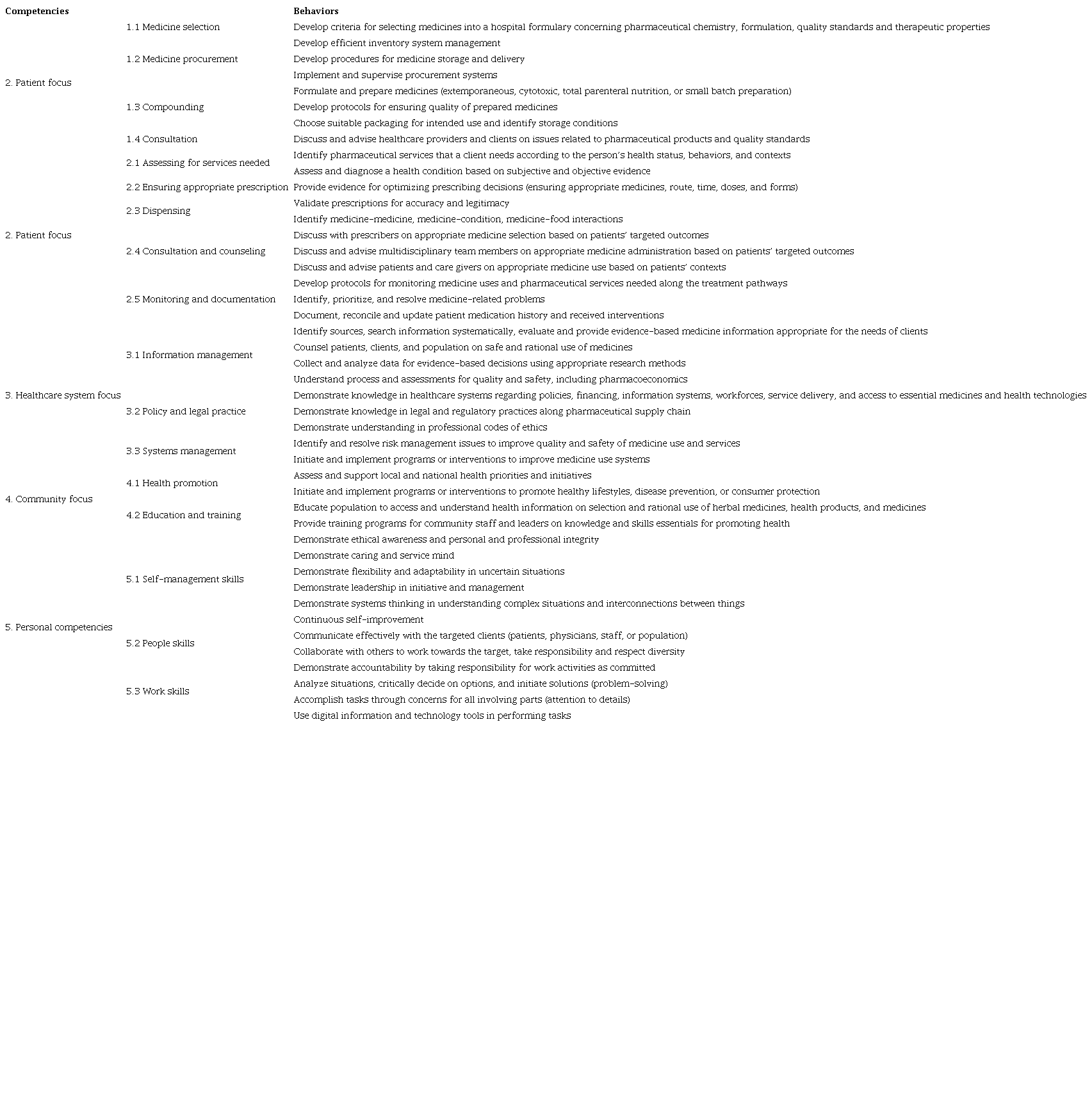 The International Pharmaceutical Federation (FIP), the global leadership of pharmacists and pharmaceutical scientists, endorses an action plan in transforming pharmacy education for preparing a workforce for pharmaceutical services development. 2, 3 The FIP recommends its members to develop an evidence-based competency framework that clearly describes competencies and scopes of practice for all stages of professional career in its development goals. 4 The FIP Global Competency Framework (GbCF) comprises 20 competencies, and 100 behavioral competencies which are divided into four domains including pharmaceutical public health, pharmaceutical care, organization and management, and professional/personal competencies. 4