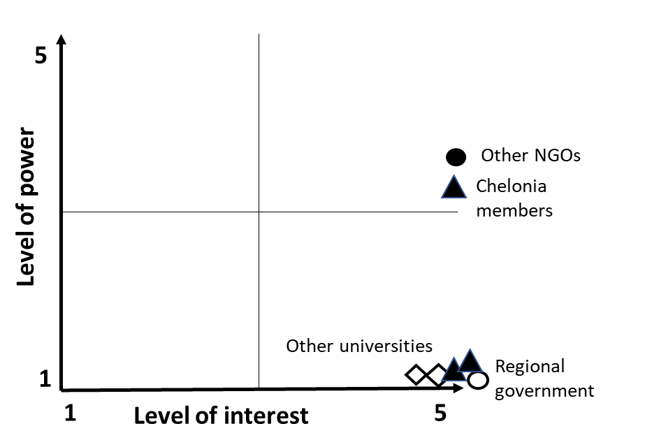 As we can see in Figure 3, all of the interviewees (NGOs, universities and regional authorities) considered that the marine turtles did have a high level of interest in the project, while perspectives were divided in regard to how much power they actually had in the project. Some Chelonia members and the other NGO Xaloc did perceive the marine turtles as having considerable power, while the rest of interviewees considered them to have no power.