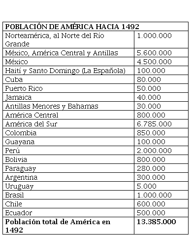 Los fundamentos sobre los que se sostienen las cifras poblacionales prehispánicas en América provienen de la antropología, la geografía, la geológica, la zoología, la botánica, la química y las fuentes escritas de los cronistas de Indias. Los avances recientes en la aplicación de la genética a estas cuestiones y otras de alto interés académico deben traer mayor luz a un campo de investigación que adolece de series continuas de datos, lo que obliga a realizar estudios demográficos de foto fija cuando, como es bien sabido, la población y sus circunstancias son fenómenos dinámicos. El paroxismo mayor se alcanza en las tesis que ofrece Riccioli, quien sustenta que a finales del siglo XV había en América 300 millones de habitantes. Mientras tanto, Borah y Dobyns, de la llamada Escuela de California, hablan de una población de 100 millones para la misma fecha. Otros autores como Sapper, Spinden, Rivet o Denevan sustentan que en la América precolombina cohabitaban entre 40 y 60 millones de indígenas. El estudioso venezolano Ángel Rosenblat calculó la población de América, antes de 1492, en 13’3 millones de personas. Kroeber, por su parte, la calcula en 8’4 millones de almas. Las enormes disparidades evidencian lo complejo del estudio de la población americana, análisis que debe sustraerse de mitos falaces de larga data.