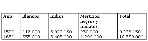 Rosenblat afirma que, a comienzos del siglo XVII, la población originaria había disminuido a diez millones de almas pero define el proceso como un cambio crítico demográfico de menor entidad e incluye, por supuesto, la aparición de una bien significativa población de mestizos fruto de la mixtura de españoles e indios, así como de mulatos. Apostilla que el suave declive de la población indígena se vio totalmente compensado por el significativo aumento de pobladores blancos, negros, mestizos y mulatos. Así estima lo que se ve en la siguiente tabla: