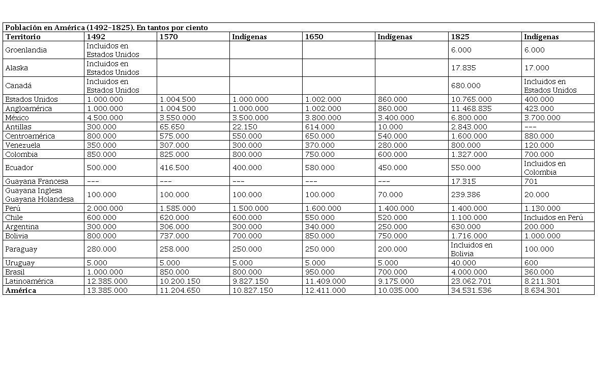 Durante los procesos de independencia en América, una parte bien significativa de su población era indígena. Así, de 34.531.536 millones de habitantes que tenía toda América, 8.634.301 lo eran según los datos ofertados por Ángel Rosenblat, es decir, exactamente el 25%. Se constata en torno al millón y medio de blancos y dos millones de negros y uno de mulatos, por lo que el 61% de la población americana en el año de 1825 era mestiza, es decir: 21.397.230 personas. La primera cuestión a destacar, y que viene a contradecir la siempre repetida tesis del exterminio indígena, es la isla La Española (actual República Dominicana y Haití), pues la etnia dominante a través del análisis del ADN de sus habitantes es la ibérica (79%) y después vienen la mesoamericana y andina con un 61’7% . En los territorios de dominación española es prevalente la etnicidad mesoamericana y andina en: Chile, Colombia, Costa Rica, Ecuador, Guatemala, México, Panamá y Perú. En Paraguay y Bolivia no hay datos pero intuimos que el resultado ha de ser similar. En todos ellos la etnia ibérica va en segundo lugar. La ibérica como etnia primera y la mesoamericana y andina como segunda es dominante en Puerto Rico, Uruguay y Argentina. Lo mismo acontece en el área de presencia portuguesa, Brasil, donde el ADN primacial es ibérico, y en segundo término el mesoamericano y andino.