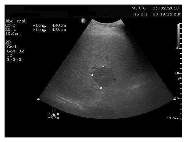 As part of the study protocol, a new ultrasound of the liver and bile ducts was performed, this showed an increased liver size, regular borders, and increased echogenicity diffusely in relation to fat infiltration. The right lobe showed three hypoechoic images of ill-defined edges of dimensions 5.6 x 3.5 cm, 4.4 x 4.2 cm, and 2.2 x 2.0 cm, respectively (Figure 1); Doppler color did not show uptake of flow. Gallbladder with dimensions of 13 x 4 x 3.5 cm, with diffuse thickening of the wall (5 mm), several stones in its interior those greater than 21 mm in diameter, in addition to the presence of biliary slime.