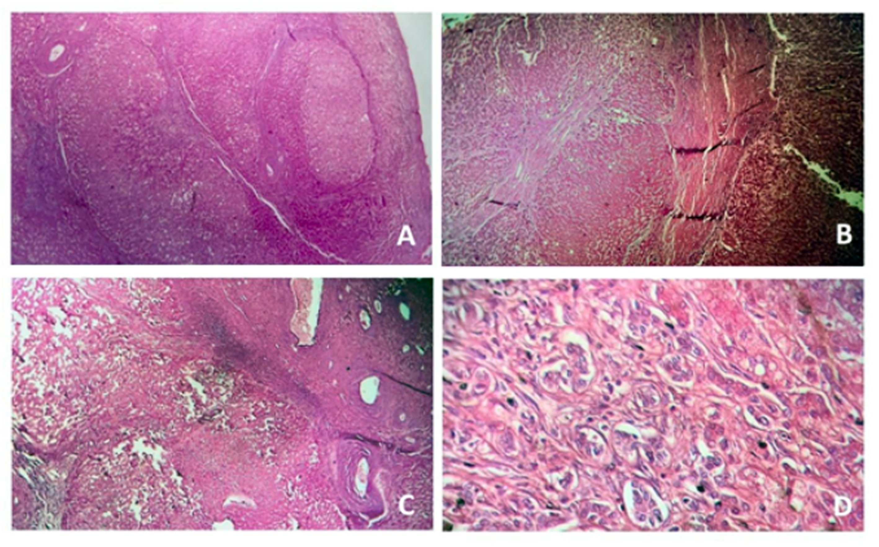 The patient underwent open cholecystectomy and liver tumor resection without complications. The following postoperative findings were reported: distended gallbladder with purulent inflammatory fluid in its interior, in an approximate amount of 50 ml, as well as multiple stones. A multinodular hepatic tumor of approximately 12 x 8 cm in diameter, with firm consistency, is also located in segment VII of the liver in the free border.
