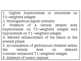 Typical MR features of focal nodular hiperplasia are iso- or hypointensity on T1-weighted images (94–100%) [12,16]; slight hyper- or isointensity on T2-weighted images (94-100%) [12,13,16], or homogeneity (96%). The central scar can be identified in 50 to 70% of the nodules of moderate to large size and a much lower percentage of small lesions (<3 cm) [16], appears hypointense in T12 [12,13,16], and hyperintense in the images enhanced in T2 (84%) [12,13,14,16]. After administration of gadolinium chelates, the enhancement profile is identical to that seen on contrast-enhanced CT: dramatic enhancement in the arterial phase16, followed by the isointensity of the lesion during the portal venous phase [12,13,16]. On delayed phase imaging, the central scar shows high signal intensity due to the accumulation of contrast material [16].