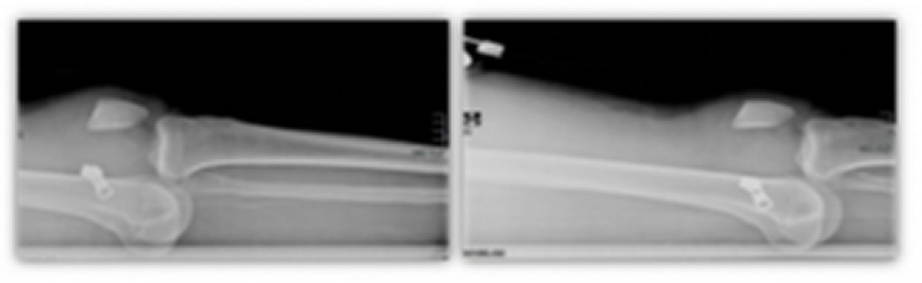 X-ray was performed to complete the study of the lower left limb, showing anterior dislocation of the knee with fracture of the left fibula head (Figure 1). According to these results, a traumatology assessment was realized, transferring the patient to the operating room to perform a closed reduction.