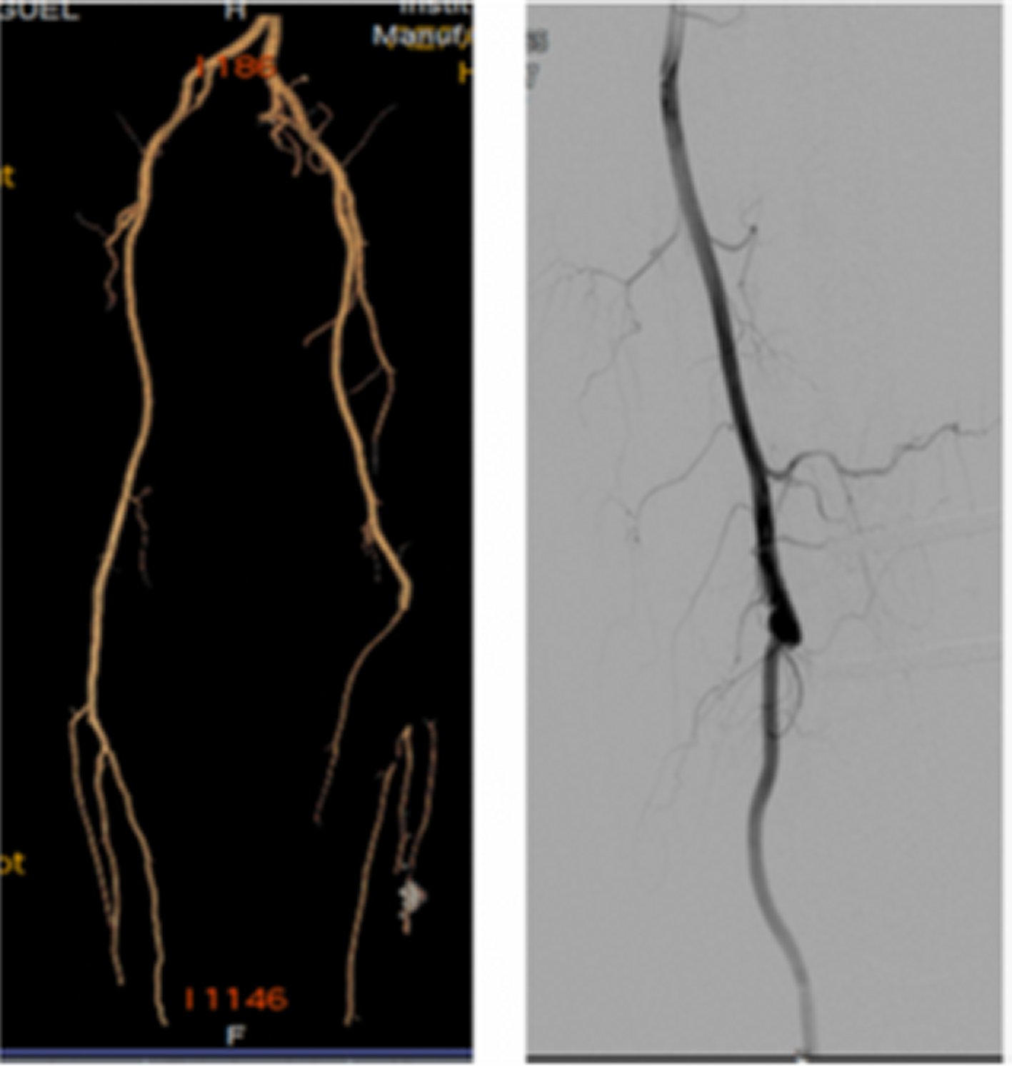 The day after the surgery, the patient referred mild pain at the level of twin musculature as well as paresthesias below the knee to the proximal region of the ankle and anesthesia of the ankle and foot. Physical examination showed complete motor deficit of the ankle and foot, without thermal disrupts as well as correct distal capillary filling, but with weak distal pulses. After this examination, a computerized axial angiotomography (angio-CT) was performed (Figure 2) revealing a complete obliteration of the left popliteal artery at the level of the femoral condyles, without observing contrast leakage suggesting a rupture or blood collections. Distal repermeabilization of the three tibioperoneal trunks was observed.