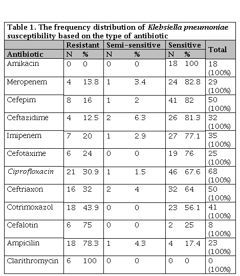 Therefore, this study aimed to investigate the antimicrobial susceptibility profile of Klebsiella pneumoniae isolates collected during the period of January 2016 till December 2017 at Ziaee Hospital in Ardakan.
