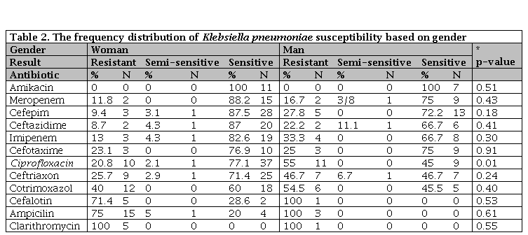 Materials and Methods: For this descriptive-analytic study, all positive cultures of Klebsiella pneumoniae in patients referred to Ziaee Hospital in Ardakan during 2016 to 2017, were evaluated. Antibiotic resistance patterns of the samples were determined by the standard method of propagation of the disk from 12 different antibiotics and data analyzed by SPSS 21 software.