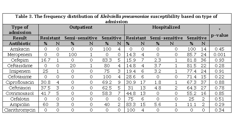 In total, the resistance to all antibiotics examined was in the hospitalized patients more than outpatient cases, but this difference was significant only for meropenem (p=0.001) and was probably due to a small number of outpatient cases (Table 3).