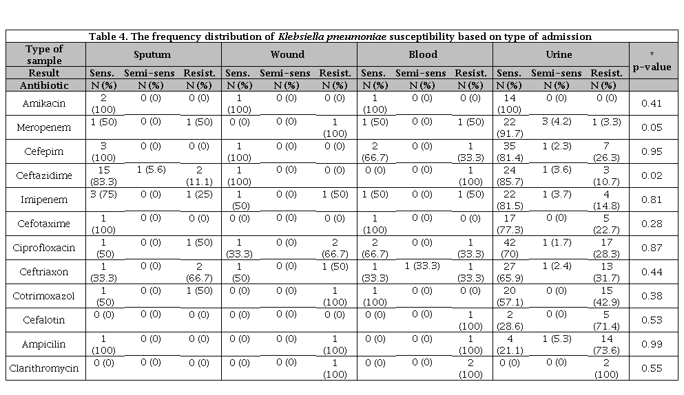 Body secretions (Other than ulcers, blood, sputum, urine) were resistant to chlorthromycin and ampicillin (100%), and 100% sensitive to cotrimoxazole, cefotaxime and ceftriaxone. The frequency distribution of Klebsiella pneumoniae sensitivity based on of sample type has been listed in Table 4.
