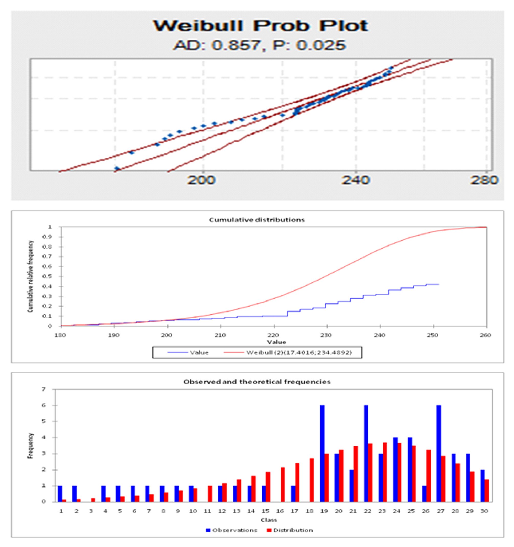 The distribution that fits best the data for the goodness of fit test is the Weibull (2) distribution. The estimated parameters were as the following: Parameter value with standard error (SE) [beta (β) 17.4016 ± 1.9222 and gamma (γ) 234.4892 ± 1.8652]. On the same line, statistics that were estimated on the input data of total mortality rates from malignancies in the USA and computed using the estimated parameters of the Weibull (2) distribution were presented as the following: Statistics (Data, Parameters) are [Mean (226.8982, 227.4390), Variance (328.1195, 260.0011), Skewness (Pearson) (-0.9484, -0.8313) and Kurtosis (Pearson) (-0.0471, 1.1410)]. Test for successful modeling was done using two means. The first goodness of fit analysis is Kolmogorov-Smirnov (KS) test [D = 0.0998, p-value = 0.5988 and alpha (α) = 0.05]. Best fitting distribution modeling was illustrated in Figure 1. The test interpretation was conducted as the following: H0 is the assumption that the sample is following a Weibull (2) distribution and Ha is the hypothesis that the sample does not follow a Weibull (2) distribution. As the computed p-value is greater than the significance level alpha (α) =0 .05, one cannot reject the null hypothesis H0. The risk to reject the null hypothesis H0 while it is true is 59.88%. Secondly, Chi-square test analysis results were as the following: Chi-square (Observed value) = 33.3957, Chi-square (Critical value) = 40.1133, DF = 27, p-value = 0.1843 and alpha (α) = 0.05. Similar to KS or K-S test, the test interpretation hypothesis was as the following: H0: The sample follows a Weibull (2) distribution Ha: The sample does not follow a Weibull (2) distribution. As the computed p-value is greater than the significance level alpha (α) =0.05, one cannot reject the null hypothesis H0. The risk to reject the null hypothesis H0 while it is true is 18.43%. Thus, Weibull (2) predictive distribution with p-value 0.5988 was the most appropriate descriptive pattern of the cancer death rates data in the USA. Spearman correlation r-value was -0.3088 with a 95% confidence interval (CI) of -0.5327 to -0.04448 for time (x) and death rate of cancer (y) 57 pairs. However, this negative and weak correlation was found to be significant at α = 0.05 with an approximate two-tailed P-value of 0.0194. The mean rate was 227±18, minimum and maximum numbers of deaths per 100000 individuals were 181 and 250, respectively with a range of 69.
