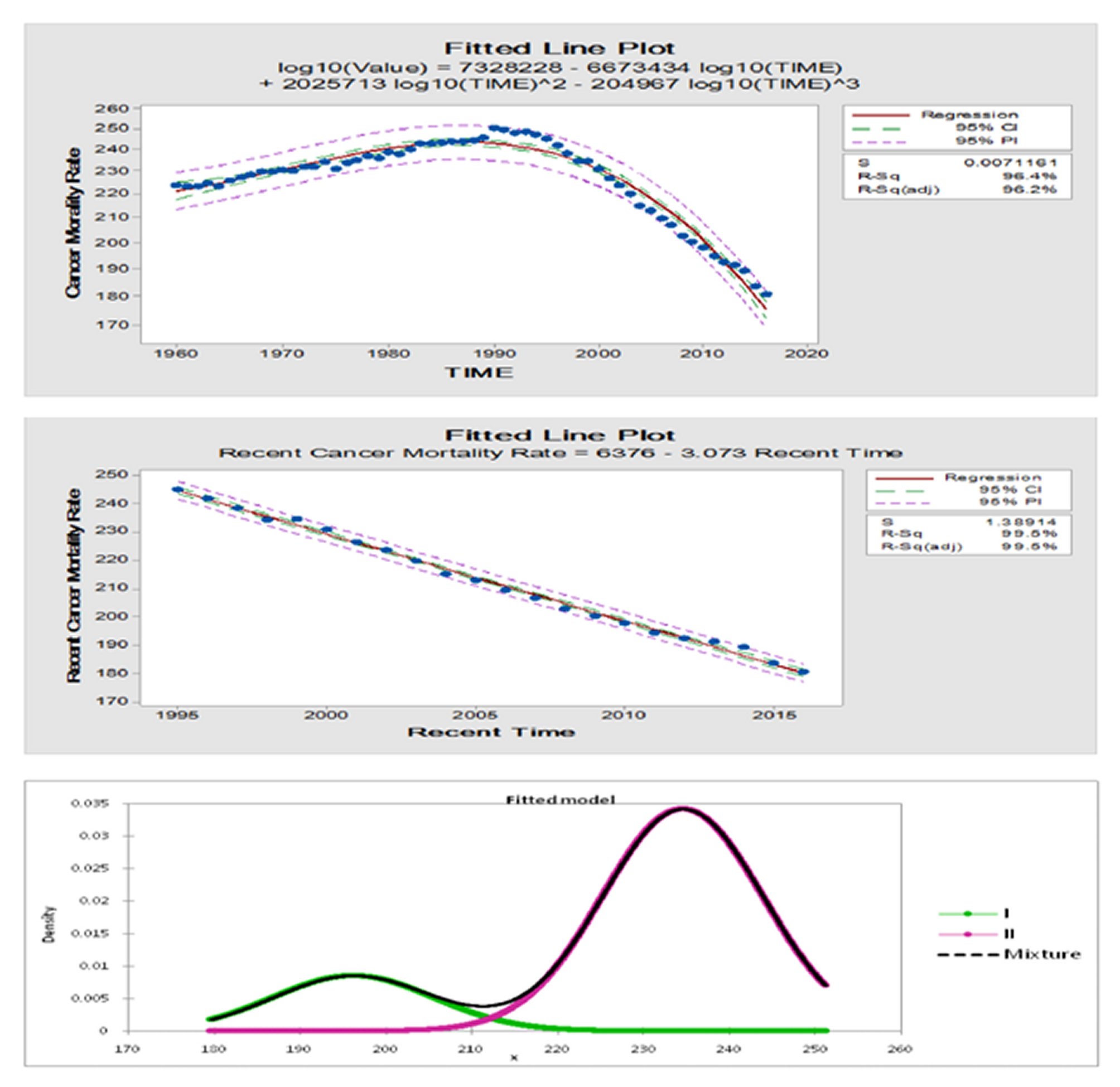 The present study illustrated one of the serious challenges of the post-world war II period that influenced the life of modern man [8, 9]. Malignancy impacts the human lifestyle adversely with primarily negative social and economical consequences in any affected nation [10, 11, 12]. SPC methodologies and statistical analysis tools are useful means in data mining and the assessment of the diseases quantitatively when suitable and appropriate datasets are available as well as in the main application in the industrial field [13, 14, 15]. Total mortality rates showed significant improvement in cancer healthcare was witnessed with a noticeable breakthrough in the last decade in the USA, which was evidenced as exceptionally low ratios of the total cancer mortalities [16]. The gradual rise in the death rate from the sixties until the nineties in the twentieth century was followed by a relatively rapid decline in mortalities ratios that should theoretically through the seventies of twenty-one century if the existing healthcare conditions were maintained for the cancer victims as from 1991 to 2017. The hump-shaped curve could be actually divided into three regions: an initial gradual increase in the mortality rates with a small positive slope from 1960 to 1991 [17], the transition period from 1991 to 2000 with a little or no increase and a start of descending pattern of the death rates and the decline phase line with statistically significant improvements during the last decade viz 2007 to 2017 [18]. Thus, the mixed nature of data had lead to the polynomial approach of the fitting. However, the initial and last segments were best fitted to a linear plot. The continuous improvement in cancer patients' survivability was indicated by outliers points in the boxplot diagram, control chart, negatively skewed distribution. Thus, the disease mortality ratios over the study period showed good fitness to the two-parameters Weibull distribution, which was demonstrated by other researchers in a previous work [19]. GMM detection of this new trend was evident as new minor distribution with a low average value of mortality. The control of malignant diseases could be sensed significantly during recent years. It is the positive outcome of the national directed efforts that started at 1971 following the signing of the National Cancer Act to stimulate extensive scientific work and research to combat malignancy in an effective fashion [20]. Nevertheless, enhancing survivability chances would be questionable due to other unexpected factors that may intercept cancer treatment, especially with the failure risk of containment of the recent Corona Virus Disease 2019 (COVID-19) viral global pandemic that could affect severely the life of the already health-defected populations.