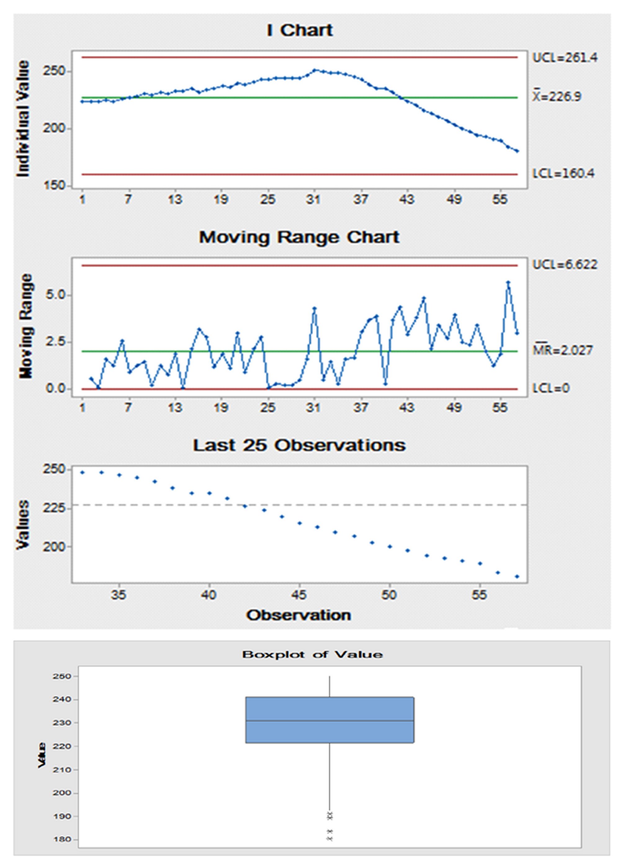 Box-and-Whisker showed normally distributed data that passed the test at 99% confidence with a tendency of the lowest recent records to fall outside the common pattern of data. This aberrant and exceptional decline in the mortality rates would be evident from the behavior of the last 25 readings that illustrated a continuous and steady decrease in the number of death cases in 100000 affected individuals. Individual-Moving Range (I-MR) control chart was constructed based on the underlying assumed dispersion pattern according to the best distribution fitted to the data. In the first component MR chart, the inter-annual general trend variation of death rates showed a tendency to rise in values, especially in the latest years within the last two decades of the record observations. Complementarily, The mortality rates - in I chart - were changing within the window of the Upper Control Limit (UCL) and Lower Control Limit (LCL) of the monitored disease. This burden represents the tolerance range of the death rate from the general long-term record that had fallen between about 160 and 261 death cases in 100000 individuals. These findings were demonstrated visually in Figure 3.