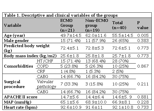 The descriptive and clinical variables of the 40 enrolled patients were summarized in Table 1. The mean age of the patients was 55.5±14.5 years (minimum 18 and maximum 80 years old) and ECMO patients were younger than non-ECMO group patients (p=0.005). The other descriptive variables and clinical parameters like gender and comorbidities did not differ between groups statistically. Most of the patients were male (n=26, 65%) and the mean predicted body weight was 72.63±5.1 kg. Coronary Artery Bypass Grafting (CABG) was the predominant surgical procedure (n=30, 75%) while the mean APACHE 2 score was 14.6±5. 9.