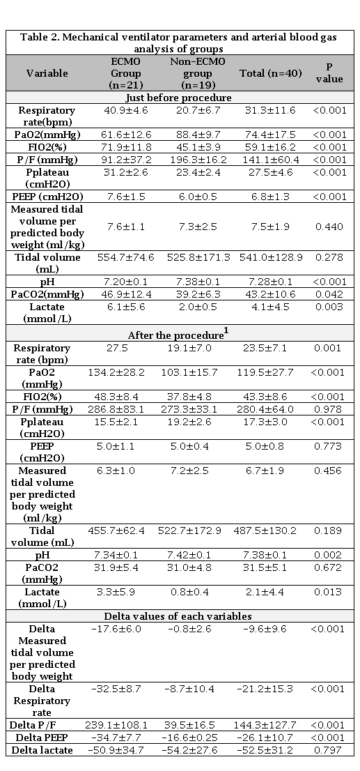 The mechanical ventilator parameters and arterial blood gas analysis were described in Table 2 lengthily. These variables were worse in the ECMO group before the procedure (just before ECMO or the first day after surgery) whereas improvement in data was more significant in the ECMO group after the procedure (on the third day after ECMO or the day before extubation). The arterial blood gas analyses and the change after ECMO were significant statistically in the ECMO group. The ratio of the paO2 to the FiO2 (mmHg) was 91.2±37.2 before ECMO (in the ECMO group) and 196.3±16.2 after surgery (in the non-ECMO group) (p=<0.001), while it was 286.8±83.1 after ECMO (in the ECMO group) and 273.3±33.1 before weaning (the non-ECMO group) (p= 0.978). The same change was observed in Pplateau (cmH2O) level as well; 31.2±2.6 vs. 23.4±2.4 and 15.5±2.1 vs. 19.2±2.6 (p<0.001). The difference in the PaCO2 and tidal volume was not differed between groups statistically (p=0.672 and 0.456) after the procedure. The same finding could be stated for the blood lactate level. 6.1±5.6 (mmol/L) and 2.0±0.5 (mmol/L) were detected before ECMO and after surgery respectively (p=0.003). The difference was significant statistically after the procedure (either ECMO or weaning) for the blood lactate level (p=0.013). Yet, the delta level of blood lactate did not differ between groups statistically (-50.9±34.7 vs. -54.2±27.6) (p=0.797).