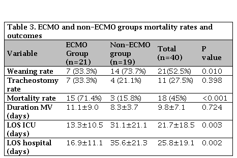 Results: The mean age of the patients was 55.57 years and ECMO patients were younger than non-ECMO group patients (p=0.005). The other descriptive variables and clinical parameters did not differ between groups statistically. The mechanical ventilator parameters and arterial blood gas analysis were worse in the ECMO group before the procedure (p <0.001) whereas improvement in data was more significant in the ECMO group after the procedure (p<0.001 in Pplateau and PaO2) . The patients in the non-ECMO group stayed longer in hospital (35.68 days vs 16.9 days) and in ICU (31.11 days vs 13.33 days) than the patients in the ECMO group. The duration of the mechanical ventilatory support did not differ between groups.