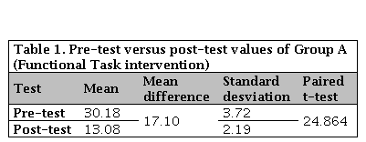 Table 1 shows the comparative mean value, means difference, standard deviation and Paired t-value between Pre versus post-test of group A (Functional task intervention). Figure 4 represents the data.