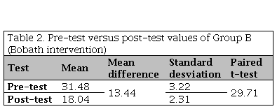 Table 2 shows the comparative mean value, means difference, standard deviation and paired t-test value between pre-test versus post-test of Group B (Bobath intervention). Figure 5 represents the data.