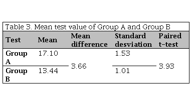 Table 3 shows the comparative mean value, mean difference, standard deviation and unpaired t-test value of group A and Group B. Figure 6 represents the data.