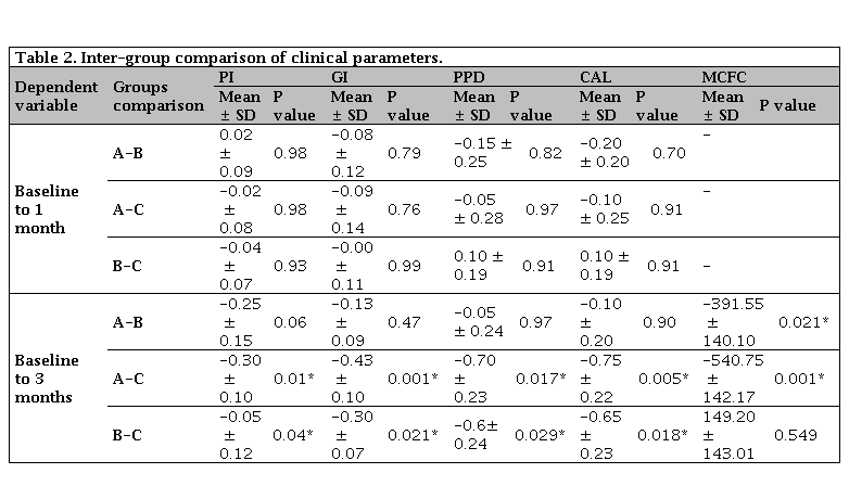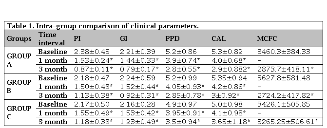 Intergroup comparison can be appreciated in Table 2 between the clinical parameters. Group A and group B showed no statistical significant difference throughout the study period. When group C was compared with Group A and group B statistical significant difference were obtained from baseline to 3 months. Whereas baseline to one month showed no significant results.