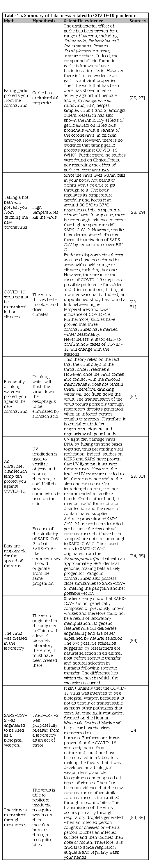 The rumors about COVID-19 treatment and prevention methods have also been circulating, creating public confusion and potentially leading to harmful self-medication. Notable rumors include eating garlic, frequently sipping hot water and taking mega-doses of vitamin C to prevent getting infected by COVID-19 has been widely shared in various social media (Facebook, WhatsApp, etc.) [51]. “Even though there is no scientific evidence to back these claims up, people have been following these pieces of advice deemed as miracle cures. Although most of the proposed ‘treatments’ are harmless, a few can lead to significant health issues, especially if handled without the supervision of a health care professional” [51]. The example of chloroquine is remarkable in this instance; three cases of chloroquine overdoses were found in Nigeria after President Donald Trump described the drug as “one of the biggest game-changers in the history of medicine” [51]. A chlorine dioxide solution with potentially life-threatening effects has also been marketed online as a medical treatment, forcing the U.S. Food and Drug Administration to issue a warning against its use [52]. These examples demonstrate the importance of spreading accurate information over conjectures that lead to confusion, which prevents us from efficiently containing the spread of this virus. Besides, Table 1a and 1b of the appendix presents several of these myths along with scientific evidence against those claims.
