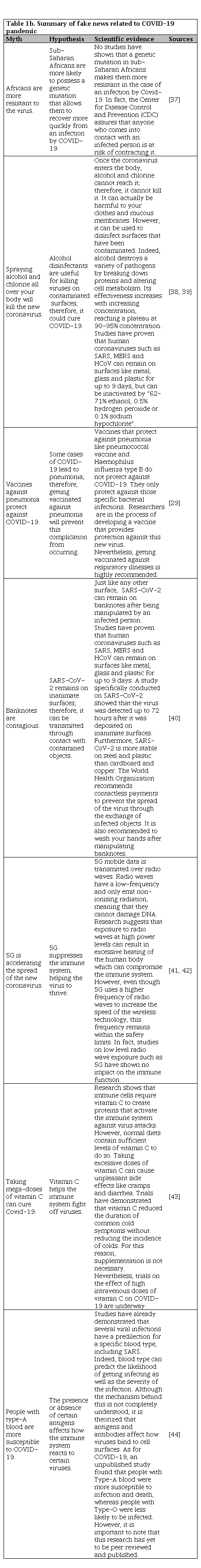 Results: We critically examined the fake news around COVID-19 disease: the disease origin, manifestations, symptoms, and treatments. The authors also explore the high expectation of people and changes in behaviors that led to risky manners, including self-medication after American President Donald Trump has claimed a major benefit of treatment with chloroquine in COVID-19. Surprisingly, the potential BCG vaccination trials in the COVID-19 pandemic were also greeted with much controversy and rejection, especially in Africa. This paper ends with some advice to various stakeholders, including leaders of global health national health organizations, and physicians on the measures to be taken in case of a similar situation in the future.