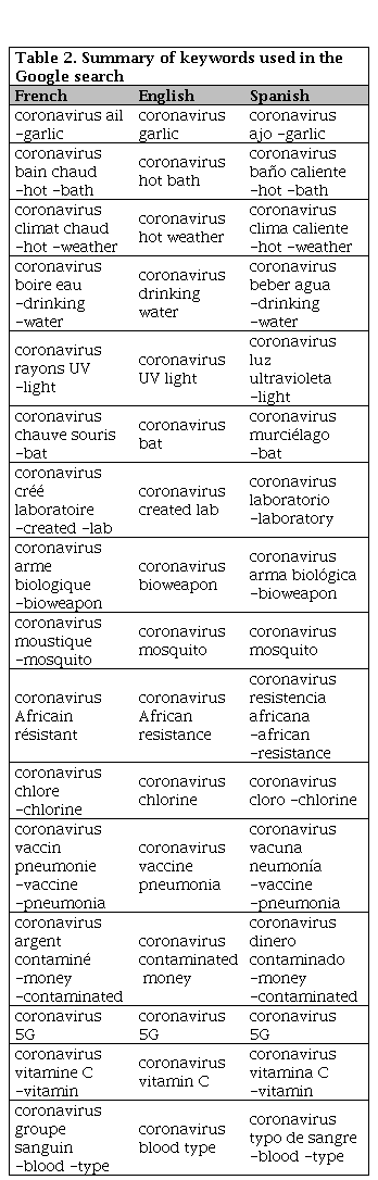 We identified relevant articles to date using a manual library search (PubMed), journal publications on the subject, and critically reviewed them. The google search was done in three languages serially, including French, English, and Spanish, for the following periods between January 1st to January 31st, February 1st to February 29th and March 1st to March 31st, 2020 respectively. Interestingly, the key highlights of fake news identified relating to COVID -19 pandemic are summarized according to Table 1a and 1b [26, 27, 28, 29, 30, 31, 32, 33, 34, 35, 36, 37, 38, 39, 40, 41, 42, 43, 44]. The various keywords used in the Google search in French, English, and Spanish, as outlined in Table 2. The numbers of results from Google search were, therefore, as represented in bar-charts with English, French, Spanish languages, according to Figure 1, Figure 2, Figure 3, respectively. Meanwhile, Table 3 shows concepts for Health Care Organizations' social media policies [45], and Table 4 represents standard guidelines for the use of social media by HCPs [46].