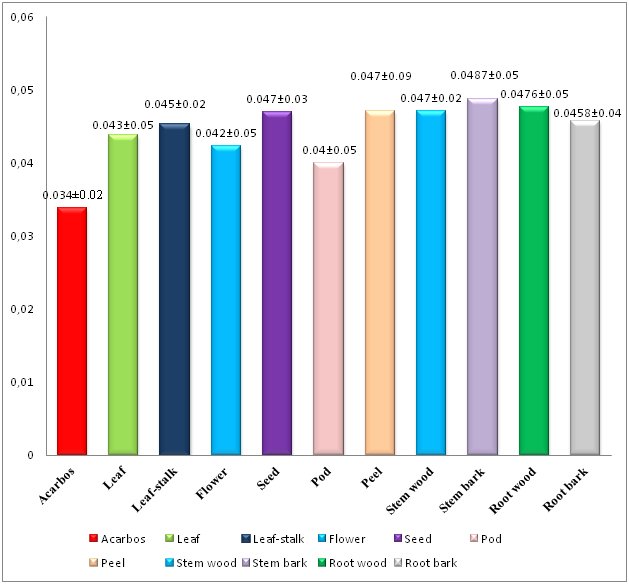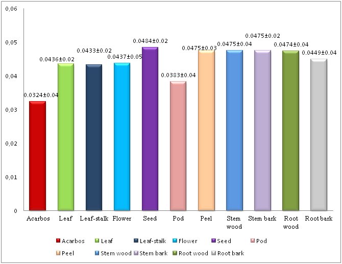 The percentage inhibition obtained for the standard anti-diabetic drug acarbose was relatively high for the concentration range used (0.1-0.02 mg/mL) as indicated on Table 2. Maximum percentage inhibition of 95.7 % was obtained for acarbose at 0.1 mg/mL and decreased slightly to 59.65 % at 0.02 mg/mL. The ten oils (Leaf, Leaf-stalk, Flower, Seed, Pod, Peel, Stem wood, Stem bark, Root wood, and Root bark) exhibited concentration-dependent inhibition similar to acarbose the standard anti-diabetic drug used. Percentage inhibition of the standard drug (95.68 %) was in close range with pod essential oil with inhibition efficiency of 80.32% at 0.1 mg/mL (Table 2). A graph of percentage inhibition versus concentration (mg/mL) of essential oils was plotted from which the IC50 values were obtained for each fraction using linear regression analysis in reference to the central standard. An inverse relationship exists between the percentage inhibition efficiency and the IC50 values. The higher the IC50 value the lower the activity of the essential oils and vice versa. The following IC50 values were obtained in the determination of α-amylase inhibition: [(Leaf, 0.043±0.05 mg/mL); (Leaf-stalk, 0.044±0.02 mg/mL); (Flower, 0.045±0.05 mg/mL); (Seed, 0.042±0.03 mg/mL); (Pod, 0.040±0.051 mg/mL); (Peel, 0.047±0.04 mg/mL); (Stem wood 0.047±0.02 mg/mL); (Stem bark, 0.049±0.05 mg/mL); (Root wood, 0,048±0.05 mg/mL) and (Root bark, 0.046±0.04 mg/mL)] compared to the standar anti-diabetic acarbose (0.034±0.02 mg/mL). The standard anti-diabetic drug with the lowest IC50 value of 0.034±0.05 mg/mL exhibited the highest α-amylase inhibition activity followed closely by Pod essential oil (0.040±0.05 mg/mL) as indicated on the bar chart in Figure 1. The least activity was expressed by the highly fibrous stem bark essential ol 0.049±0.01 mg/mL. The high α-amylase inhibition of the pod essential oil in comparison with the standard anti-diabetic drug must be due to the presence of some important bioactive phyto-contituents.