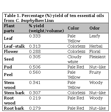 Essential oils obtained from ten (10) parts of C. inophyllum Linn gave characteristic odours and colours. The oils were procured in 0.219 to 0.506 % yields (Table 1), with the highest yield from the peel, which gave 0.560 %, while the root had the lowest yield (0.219%), which may be due to its high fiber content.