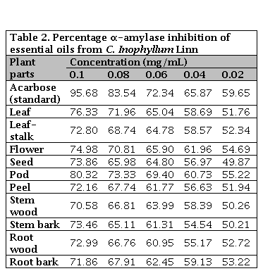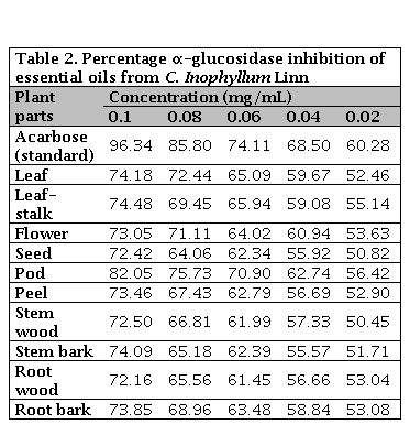 Materials and methods: Essential oils from ten parts of C. inophyllum Linn were extracted by hydro-distillation using all-glass Clevenger-type apparatus. The percentage yields (w/v) were between 0.219 and 0.506 %. A plot of percentage inhibition versus concentration (mg/mL) of essential oils gave the IC50 values for each essential oil using non-linear regression analysis in reference to acarbose a standard anti-diabetic drug.