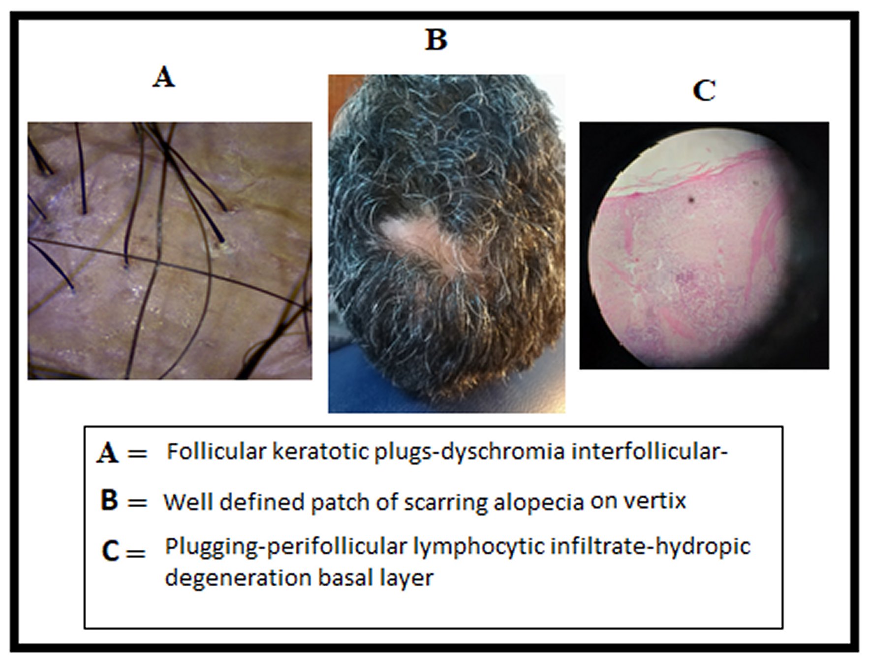 Patients with neutrophilic exudation lesions exhibited tufting hair-follicular and loss of follicular ostia as seen by tricoscopic examination, with rate of 35.4%. However, the percentage of affected patients is higher than other studies [14]. Follicular keratotic plugs, follicular hyperkeratosis, and Peripilar tubular cast in our patients were mostly seen with lymphocytic exudate lesions.