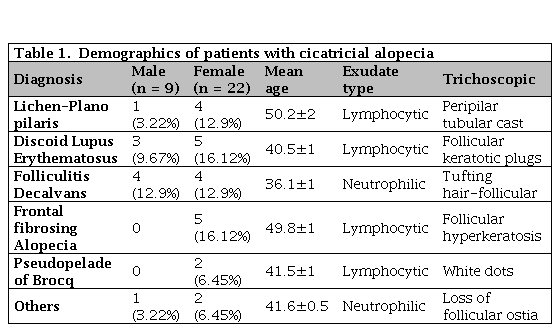A total of 31 patients with diagnosis of cicatricial alopecia including 22 females (71%) and 9 males (29%) were participated in this study. The range of age was 15 to 55 years old. Most of the cases were from 36-42 years old. 16.1% of patients suffered from lichen planopilaris (LPP) (4 female and 1 male), 25.8% discoid lupus erythematosus (DLE) (5 female and 3 male), 6% Folliculitis decalvans (4 female and 4 male), 6.45% pseudopelade of Brocq (2 female and no male) and 16.12% Frontal fibrosing alopecia (5 female and no male).