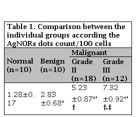 The mean values of Ag NORs silver stain dots count for normal, benign, grade II and III were 1.28±0.17, 2.83±0.68, 5.23±0.87and 7.32±0.92 respectively. There was a statistically significant difference (p≤0.001) was noticed between the all individual groups, among the normal and breast lesion as well as among the GII and GIII, as shown in Table 1.