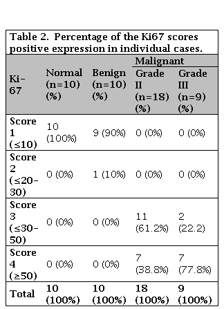 Paraffin sections for 40 cases were stained by Ki67 protein monoclonal antibody used avidin biotin complex (ABC) and DAB chromogen as precipitate color stain. The immunohistochemical staining appeared as brown granules stained in the nuclei and the negative control slide was stained with ommited the primary antibody (Ki67 protein) and the blue color indicated to the negative control nuclei. The expression of the Ki67 appeared homogenous golden-brown color in control case and a positive brown granules or diffuse dark brown color in the nuclei of both benign and malignant cases under the 400X magnify examined under the light microscope. Under the high magnify (1000X) the positive nuclei appeared as dark brown granules spread in the nuclei and some nuclei have a coarse granule in nucleoli surrounded by a small granule in nuclei matrix was observed. The results were illustrated in Figure 2 and Table 2.