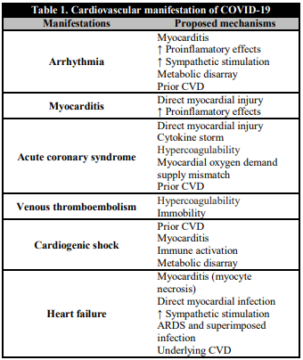 The emergence of novel coronavirus known as Severe Acute Respiratory Syndrome-Coronavirus-2 (SARS-CoV-2), has presented an unprecedented challenge for the healthcare professionals across the world. High infectivity, ability to get transmitted even during asymptomatic phase and relatively low virulence has resulted in rapid transmission of this virus beyond geographic regions, leading to a pandemic. The first case of this disease, known as coronavirus disease 2019 (COVID-2019), occurred on December 8, 2019 in the Hubei province of China [1]. Since then, the statistics are staggering and relentlessly mounting. As of April 20/04/ 2020, there have been more than 2314621 individuals in more than 210 countries with confirmed COVID-19, of whom more than 157847 have died [2]. While it predominantly affects the respiratory system, SARS-CoV-2 has also been shown to affect cardiovascular damage [3]. It appears that preexisting cardiovascular disease (CVD) and CV risk factors enhance vulnerability to COVID-19. Further, COVID-19 can worsen underlying CVD and even precipitate de novo cardiac complications [4]. This review highlights overview of various CV manifestations in patients presenting with COVID-19 including the impact of pre-existing CVD and new onset cardiac complications on clinical outcomes. As our knowledge of COVID-19 is still evolving, the information in subsequent text is based mainly on the limited early experience with COVID-19 and learning from outbreaks of SARS and Middle East respiratory syndrome (MERS).
