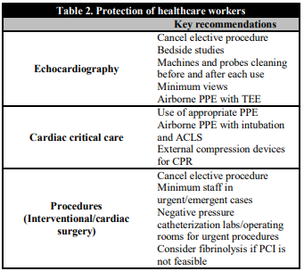 All healthcare personnel engaged in the care of COVID-19 patients must observe necessary precautions at all times. All of them should be trained in donning, usage, and doffing of the personal protective equipment (PPE). Since the very beginning of the COVID-19 outbreak, the WHO maintains the recommendation of using medical masks for regular care of COVID-19 patients in the context of droplet and contact precautions, and respirators (N95, FFP2 or FFP3) for circumstances and settings where aerosol generation can occur such as transesophageal echocardiography, endotracheal intubation, cardiopulmonary resuscitation and bag mask ventilation [73]. PPE with aerosolization protection for the entire catheterization laboratory staff during PCI for all STEMI patients during this COVID-19 pandemic is recommended as per the previously published ACC/SCAI guidelines for managing CCL patients during the COVID-19 epidemic [74]. It is essential to consider minimization of the number of healthcare staff potentially exposed during invasive cardiovascular procedures; this may include limiting the involvement of trainees in high risk procedures and patients. Healthcare workers in the setting of cardiac arrest and chest compressions should be encouraged to use external mechanical compression devices to minimize direct contact with infected patients (Table 2). Elective procedures should be cancelled or kept minimum during this pandemic considering limited availability of catheterization laboratory because of the necessary downtime required for cleaning. There have been reports of centers in China converting positive pressure ventilation configured operating theatres to negative pressure isolation in the setting of COVID-19 [75].
