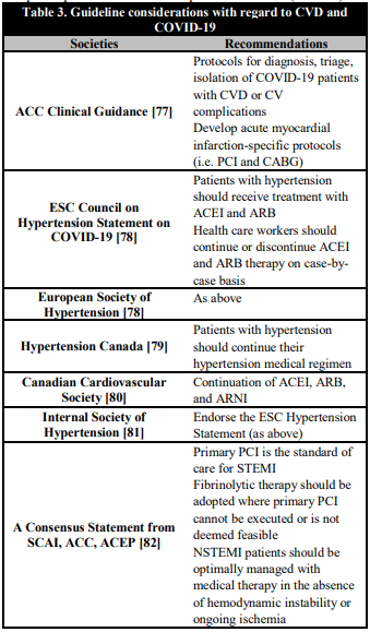 Given the clear implications of this pandemic on CV care, numerous societies have already provided guidance statements, which are summarized in Table 3. The ACC Clinical Bulletin discusses about key implications and recommendations for CV care of COVID-19 patients [77]. The ESC Council on Hypertension and European Society of Hypertension statement sheds light on ACEI and ARB therapy in such pandemic [78]. The various societies are of the views that further data would be vital for adjusting regimens of these agents during the current outbreak [78, 79, 80, 81]. The hospitals may have to prioritize the treatment of severe and high-risk patients as the pandemic surges. While preserving limited in-patient resources and minimizing provider and patient exposures, specific protocols will be required to be developed. There are reports of individual centers utilizing fibrinolytic therapy for STEMI if delays to primary PCI are anticipated when hospitals are at capacity or staffing for the catheterization lab is inadequate [83]. Primary PCI remains the standard of care for STEMI patients at PCI capable hospitals when it can be provided in a timely fashion, with an expert team outfitted with PPE in a dedicated cardiac catheterization room. Fibrinolytic therapy may be adopted at non-PCI capable referral hospitals or in specific situations where primary PCI cannot be executed or is not deemed feasible. NSTEMI patients who are COVID-19 positive or probable are optimally managed with medical therapy in the absence of hemodynamic instability or ongoing ischemia. Finally, the care of patients will require the integrated approach incorporating expertise of many specialty services including pulmonology, critical care, infectious diseases, cardiology, surgery, pharmacy, and hospital administration among others [38].