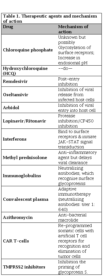 An outbreak of pneumonic illness was first reported in Wuhan, China on December 31, 2019. It was recognized as coronavirus disease-2019 (COVID-19), caused by a novel coronavirus (2019-nCoV), renamed later as SARS-CoV-2. As of today, more than 12,315,542 people are infected and there are 554955 deaths worldwide (https://www.worldometers.info/coronavirus). COVID-19 is the 3rd coronavirus spread in 2 decades with a debatable origin. The incubation period of COVID-19 is 3-7-14 days [1, 2]. The disease usually affects adults although critical illness has also been reported in infants. Initial symptoms are fever and dry cough, followed by protracted deterioration to bilateral “Wuhan pneumonia”, breathlessness, and death from respiratory failure due to pulmonary intravascular coagulation (PIC) [3]. Consistent expression of ACE2R on various structures (e.g., lungs, gastrointestinal tract, liver, and blood vessels) renders these organs predisposed to cell entry by the virus resulting in diverse symptoms. The inflammatory response in COVID-19 is reflected by increased C-reactive protein (CRP), erythrocyte sedimentation rate (ESR), lactic dehydrogenase (LDH), D-dimers & transaminases. There is hypoalbuminemia, leukopenia, and lymphocytopenia in 50-75% of cases [4, 5]. Typical radiologic features include: peripheral involvement, pulmonary infiltrates, bilateral pneumonia, and ground-glass opacity [1]. However, the final diagnosis rests on the rRT-PCR of respiratory samples, preferably obtained from the lower respiratory tract, nasopharynx, and oropharynx [2]. The diagnostic sensitivity of rRT-PCR is approximately 70% which usually confirms the diagnosis of COVID-19. Whereas false-positive rRT-PCR occurs due to sampling contamination and degraded/non-transmissible RNA [5, 6], the false-negative rRT-PCR exceeds 30% so that two consecutive negative RNA results are required before releasing the patient of COVID-19 [5, 7]. Serum and urine are often negative for SARS-CoV-2 RNA [5]. Serology is non-diagnostic in the acute phase of COVID-19 because seroconversion takes 7-11 days. About 15% of antibody tests are false positive. There is no recommended treatment for COVID-19. Various drugs are under trial as single or combinatorial therapy. Most of these agents are metabolized by the liver and demonstrate renal excretion (Table 1). Serious side-effects may occur in COVID-19 related hepato-renal injury [8].